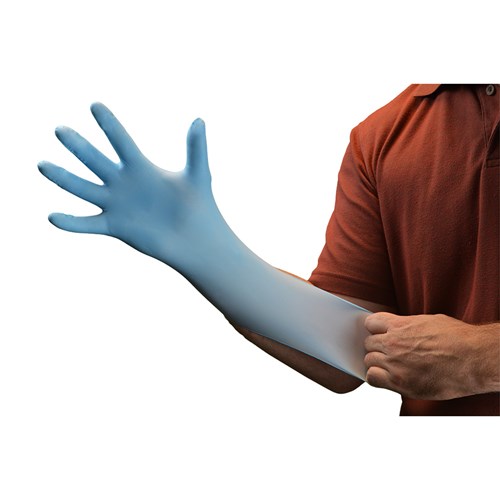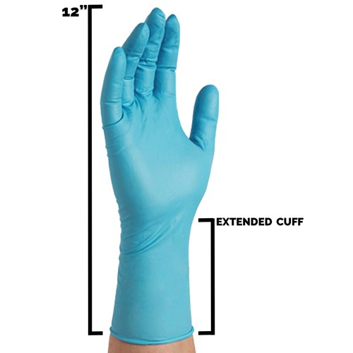 AMMEX Xtreme Blue Extra Long Nitrile Powder Free Exam Gloves have an extended cuff more than 2 inches longer than standard disposable gloves. It protects your forearm from splashes and helps to keep liquids from running down the inside.